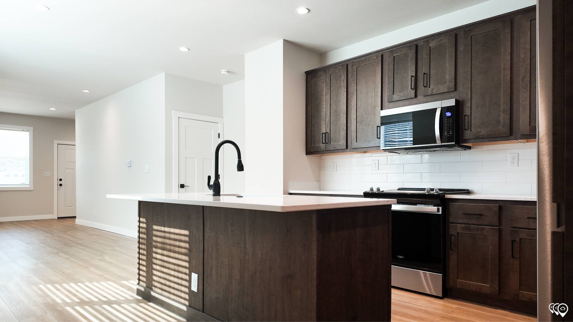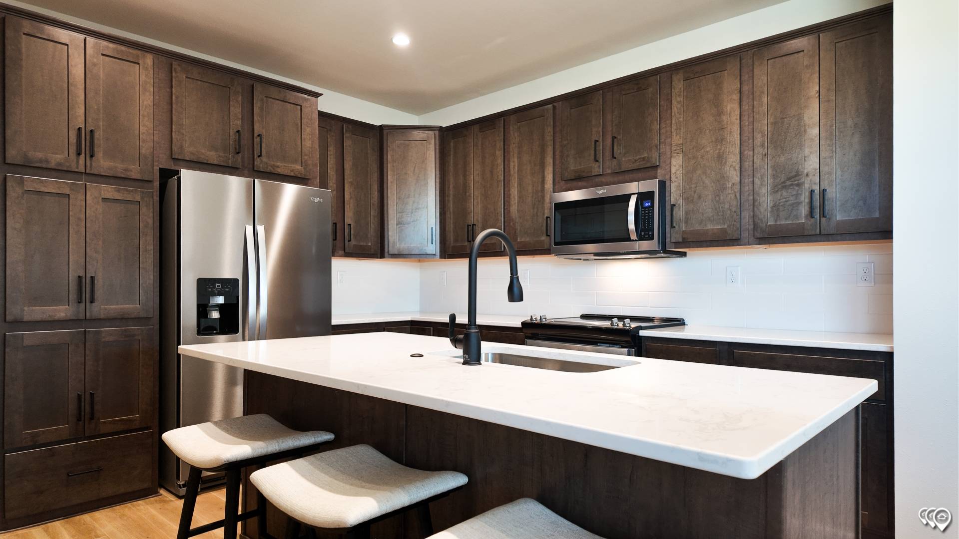 Kitchen Cabinetry: Kensington Maple Mocha or Kensington Dusk Cabinets / Stained Wood Stiles & Face Frames / Crown Molding on Overhead Cabinets